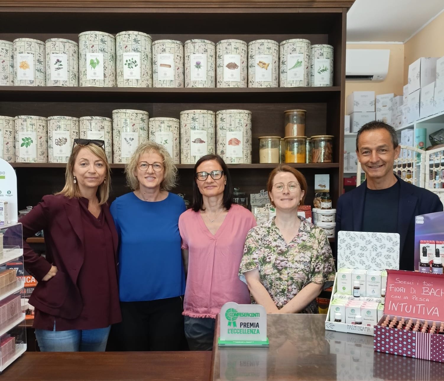 Nella foto la consegna del premio con: Alessandro Pireddu e Chiara Baldrati, l'assessore Igor Gallonetto, Graziano Gozi e Sara Reali per Confesercenti.