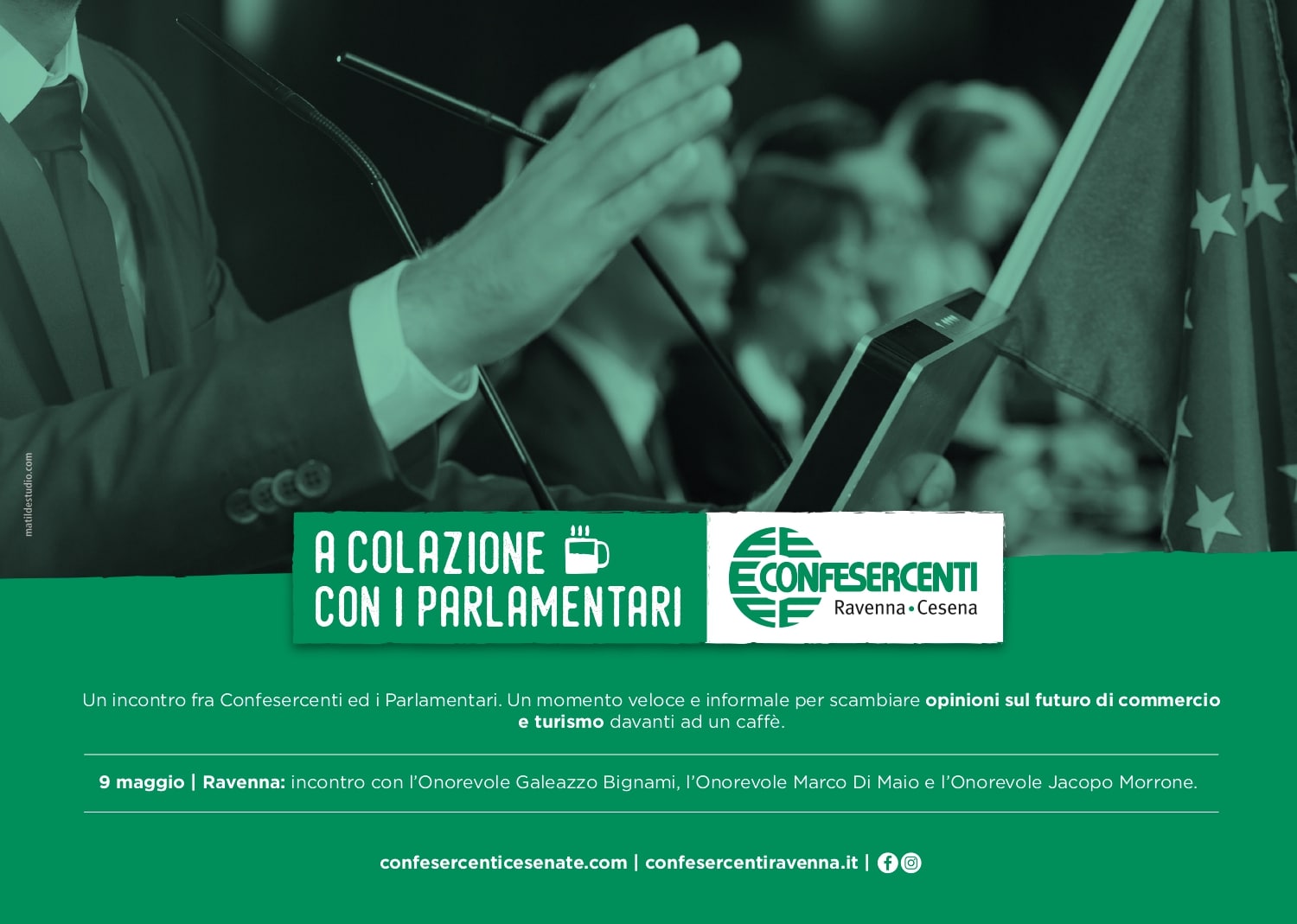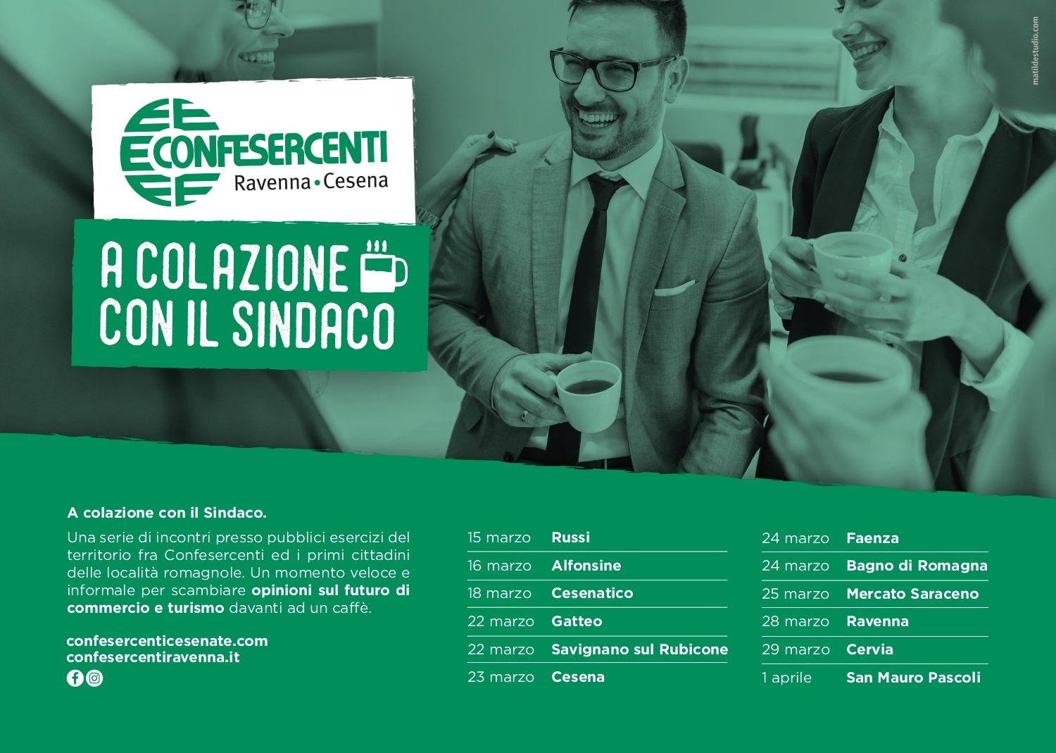 Edizione 2024Confesercenti Ravenna-Cesena organizza per il terzo anno consecutivo il ciclo di incontri “A colazione con …”: una serie di appuntamenti presso pubblici esercizi del territorio fra l’associazione ed ospiti in località romagnole nel mese di febbraio. Un momento veloce e informale per scambiare opinioni sul futuro di commercio e turismo davanti ad un caffè. Direttori di Istituti di Credito, presidente di Camera di Commercio, presidente di Provincia, Hera. (continua a leggere qui) |