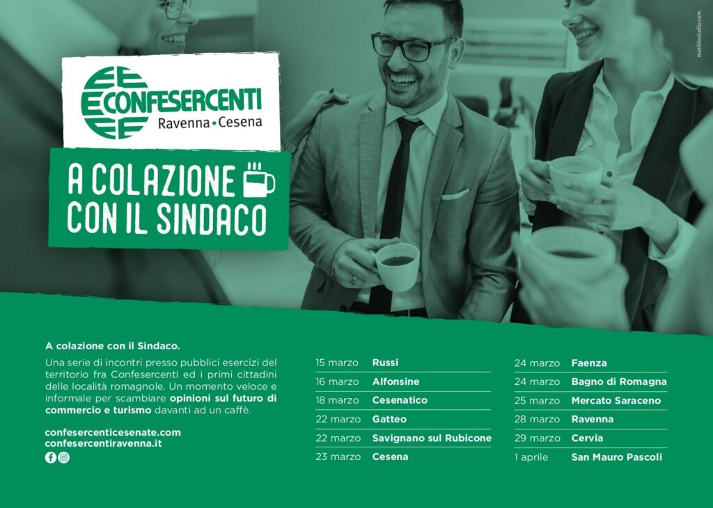 Confesercenti Ravenna-Cesena organizza per il terzo anno consecutivo il ciclo di incontri “A colazione con …”: una serie di appuntamenti presso pubblici esercizi del territorio fra l’associazione ed ospiti in località romagnole nel mese di febbraio. Un momento veloce e informale per scambiare opinioni sul futuro di commercio e turismo davanti ad un caffè. Direttori di Istituti di Credito, presidente di Camera di Commercio, presidente di Provincia, Hera.