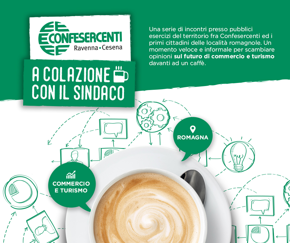 La Confesercenti Ravenna-Cesena organizza nuovamente il ciclo di incontri “A colazione con il Sindaco”: una serie di appuntamenti che si terranno presso pubblici esercizi del territorio fra l'associazione ed i primi cittadini di località romagnole. Un momento veloce e informale per scambiare opinioni sul futuro di commercio e turismo davanti ad un caffè.