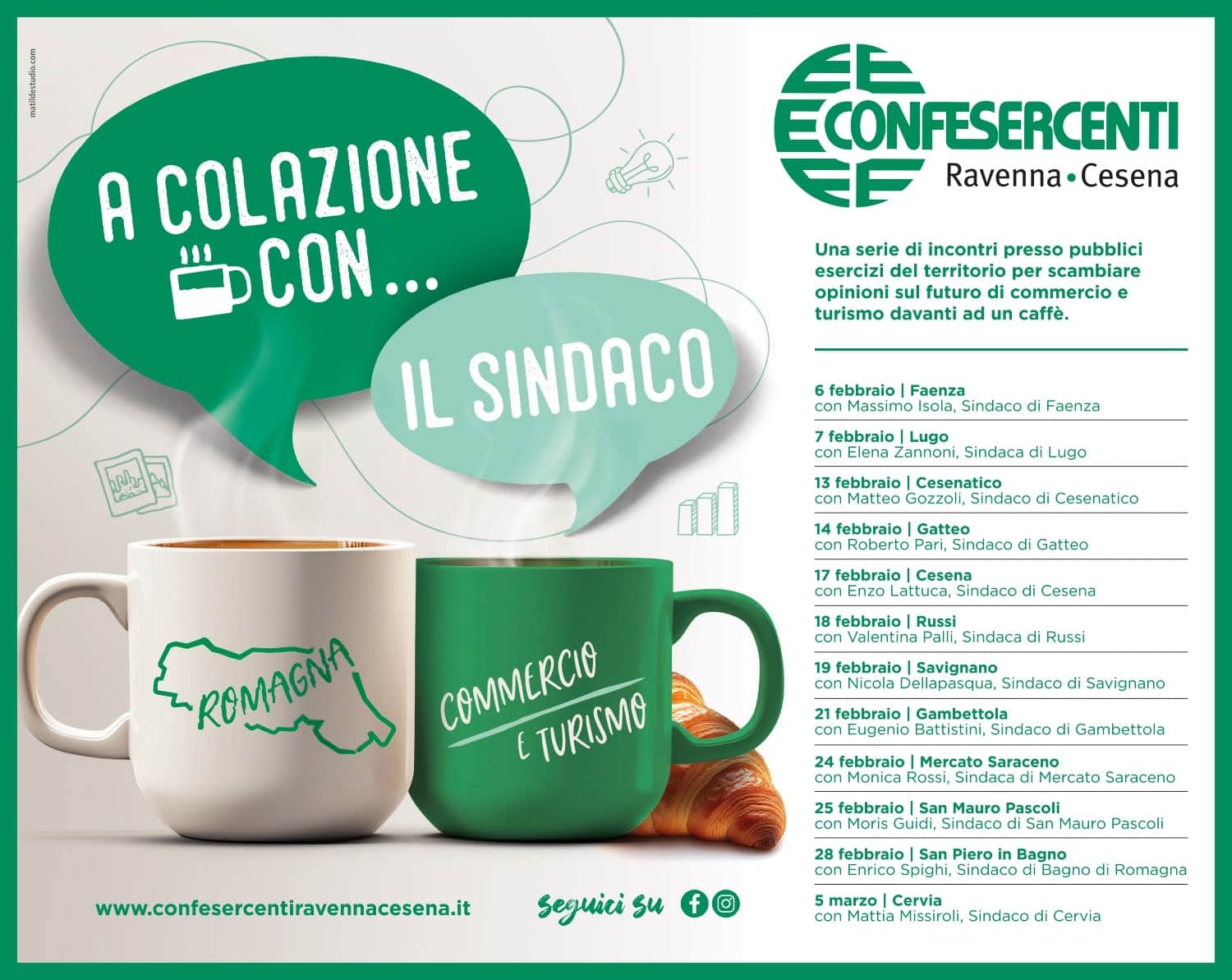 La Confesercenti Ravenna-Cesena organizza nuovamente il ciclo di incontri “A colazione con il Sindaco”, un momento veloce ed informale per scambiare opinioni sul futuro di commercio e turismo davanti ad un caffè con i primi cittadini di alcune città romagnole in provincia di Ravenna e nel cesenate.