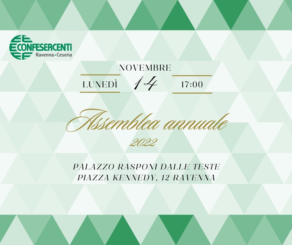 Lunedì 14 novembre alle ore 17 l’assemblea annuale di Confesercenti Ravenna-Cesena è convocata a Palazzo Rasponi in Piazza Kennedy a Ravenna dalla presidente Monica Ciarapica e dal vicepresidente Cesare Soldati, che introdurranno gli ospiti e avvieranno i lavori di una tavola rotonda coordinata dal giornalista Carmelo Domini.