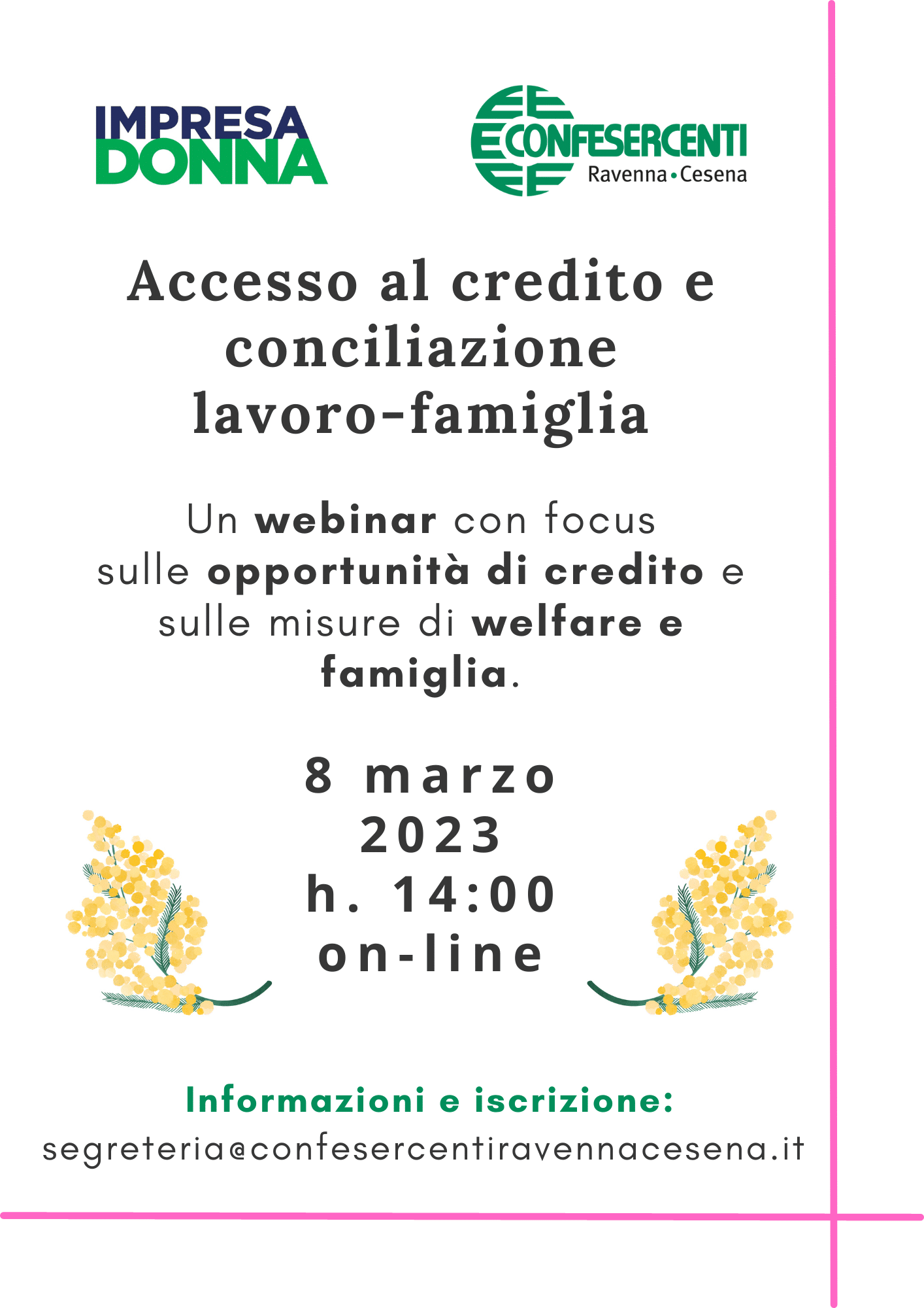 Confesercenti Ravenna-Cesena organizza e promuove un momento di confronto dedicato alle imprenditrici in occasione del prossimo 8 marzo: alle 14, infatti, ci si potrà collegare ad un webinar con focus su credito e conciliazione lavoro-famiglia.