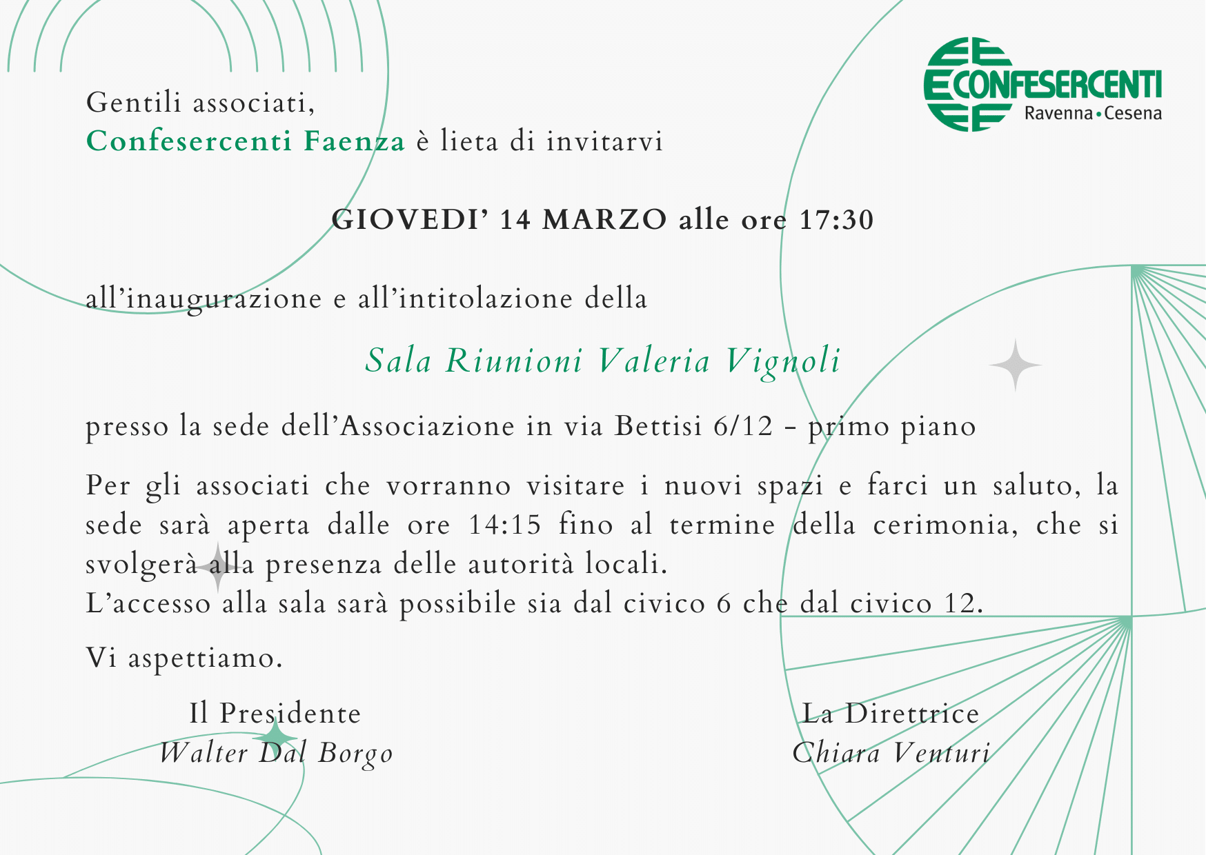 I soci sono invitati a partecipare a questo momento collettivo, anche per ricordare l'imprenditrice Valeria Vignoli, già presidente Confesercenti Faenza, a cui sarà intitolata la nuova sala riunioni.