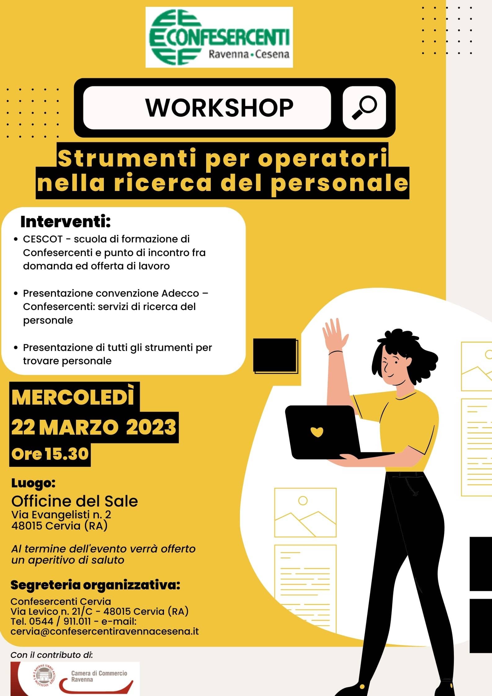 Per venire incontro e aiutare i propri associati, Confesercenti Ravenna Cesena, in collaborazione con Adecco – Agenzia del Lavoro, organizza un workshop “Strumenti per operatori nella ricerca del personale”, mercoledì 22 marzo 2023, alle ore 15.30, presso la sala “Teatro” delle Officine del Sale (Via Evangelisti n. 2).