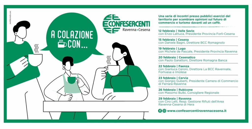 Confesercenti Ravenna-Cesena organizza per il terzo anno consecutivo il ciclo di incontri “A colazione con …”: una serie di appuntamenti che si terranno presso pubblici esercizi del territorio fra l'associazione ed ospiti in località romagnole nel mese di febbraio.